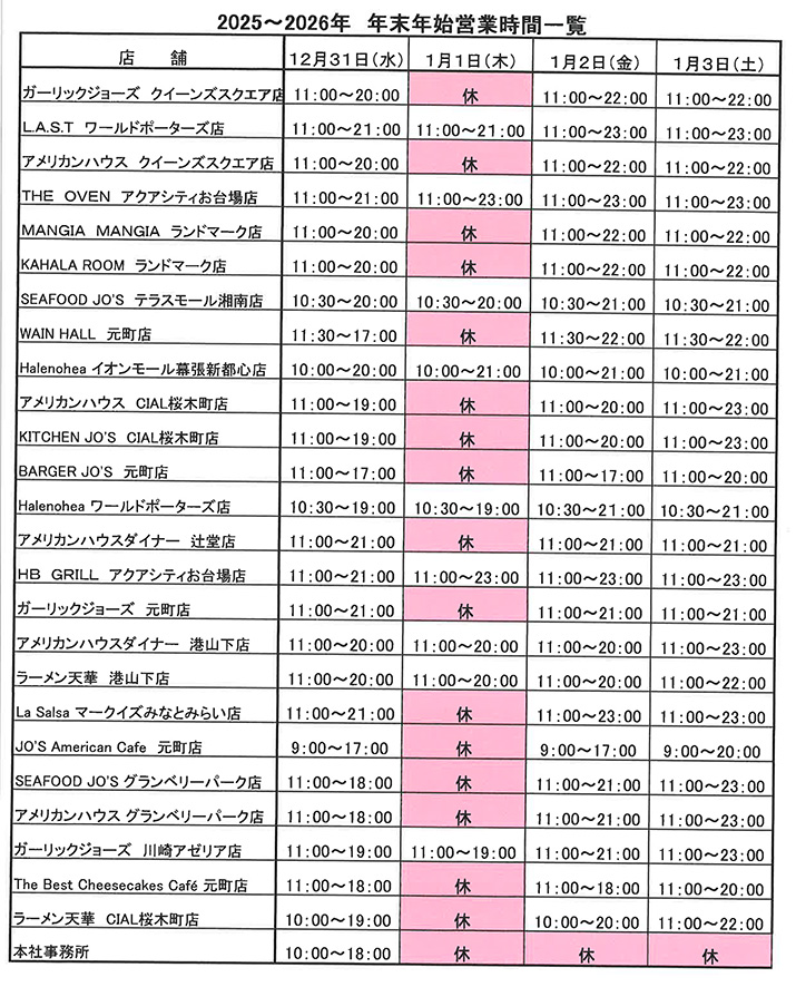 各店舗 年末年始営業時間のお知らせ。